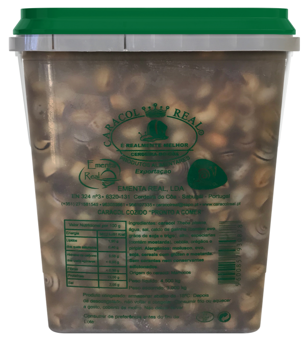 Nota Importante: No Caracol Real®, temos muito cuidado para servir as especialidases e refeições com excelente qualidade aos nossos clientes, sempre que visitam a nossa fábrica ou adquiram num qualquer estabelecimwento comercial. O Caracol Real® entende que cada um dos nossos clientes tem necessidades e considerações individuais ao escolher um dos nossos pprodutos alimentares, especialmente os clientes com alergias alimentares. Como parte de nosso compromisso com o cliente, fornecemos as informações mais atualizadas sobre ingredientes disponíveis de nossos fornecedores de alimentos para os principais alérgenos mais comuns identificados na Rotulagem da Lista de Alérgenos. Alergénios - Substâncias e/ou produtos causadores de alergias ou intolerâncias. (ovos, laticínios, trigo, soja, amendoim, nozes e peixes). e marisco) entre outros, para que os nossos clientes com alergias alimentares possam fazer escolhas alimentares informadas. No entanto, também queremos que você saiba que, apesar de tomar precauções, as operações normais da cozinha podem envolver algumas áreas compartilhadas de preparo, equipamentos e utensílios, e existe a possibilidade de seus itens alimentares entrarem em contato com outros produtos alimentícios, inclusive alérgenos. O Caracol Real® encorajamos os nossos clientes com alergias alimentares ou necessidades dietéticas especiais a visitar o site www.caracolreal.pt para obter informações sobre ingredientes, e consultar o seu médico para perguntas sobre a sua dieta. Devido à natureza individualizada das alergias alimentares e das sensibilidades alimentares, os médicos dos clientes podem estar melhor posicionados para fazer recomendações para clientes com alergias alimentares e necessidades dietéticas especiais. Se você tiver dúvidas sobre nossos alimentos, entre em contato connosco diretamente pelo site www.caracolreal.pt, por telefone 27 158 15 49 ou pelo 96 305 36 61. ** Porcentagem de valores diários (DV) são baseados em uma dieta de 2.000 calorias. Os valores diários podem ser maiores ou menores dependendo de suas necessidades energéticas. As informações nutricionais deste site são derivadas de testes realizados em laboratórios credenciados, recursos publicados ou informações fornecidas pelos fornecedores do Caracol Real®. A informação nutricional é baseada em formulações de produtos padrão e tamanhos de porção. Todas as informações nutricionais são baseadas nos valores médios dos ingredientes dos fornecedores Caracol Real® e são arredondados para atender às diretrizes atuais. A variação nos tamanhos de serviço, as técnicas de preparação, os testes de produtos e as fontes de suprimento, bem como as diferenças regionais e sazonais, podem afetar os valores nutricionais de cada produto. Além disso, as formulações do produto mudam periodicamente. O cliente pode esperar alguma variação no conteúdo de nutrientes dos produtos comprados na nossa fábrica. Esta informação está correta a partir de julho de 2018, salvo indicação em contrário.